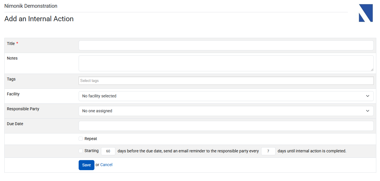 Choose a title, facility, responsible party, and due date, and add instructions to your internal action.
