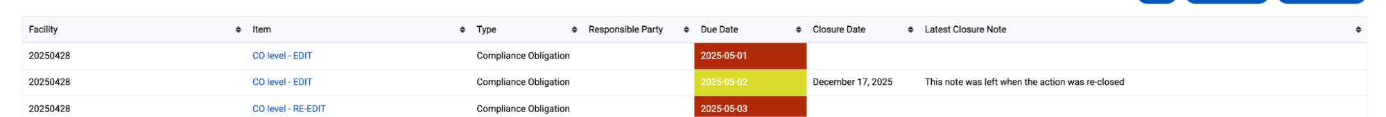 By default, only the actions assigned to you during the next three months will be visible, but you can user the filters at the top of the page to see actions with different due dates and responsible parties. The actions that can be seen are determined by your user role and permission.