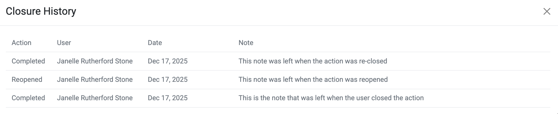 When a user clicks on it, they can now see a history of when their internal actions were opened and closed, as well as the notes left by the person who opened/closed them.