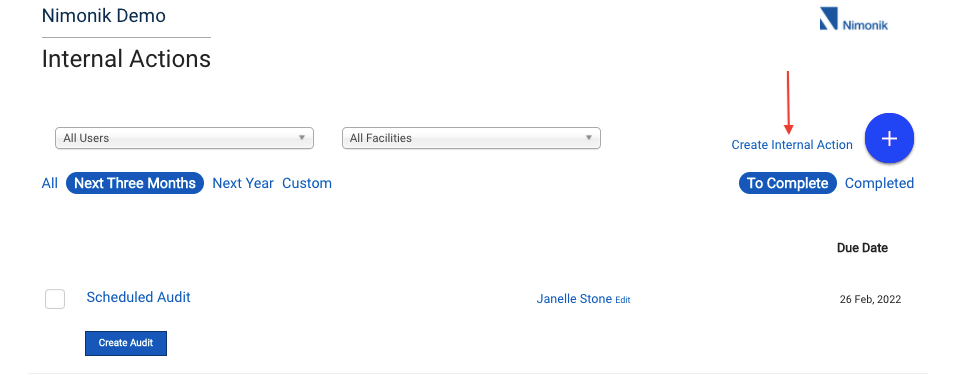Independent internal actions allow you to assign actions with due dates that are not linked to any specific account item (COs, Audits, Etc.).