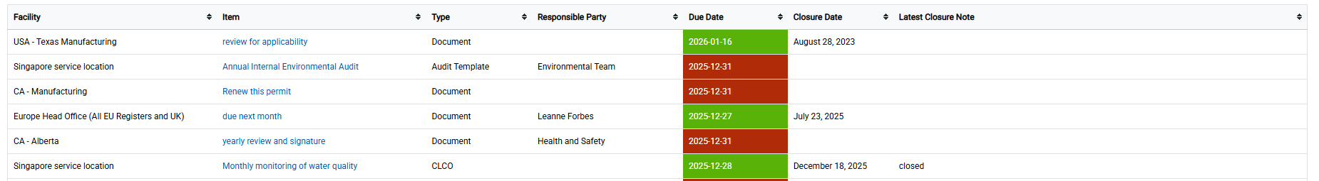 - Item – The task associated with the Internal Action (With a clickable link to the Internal Action)