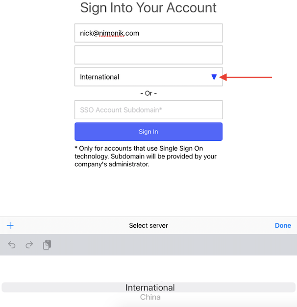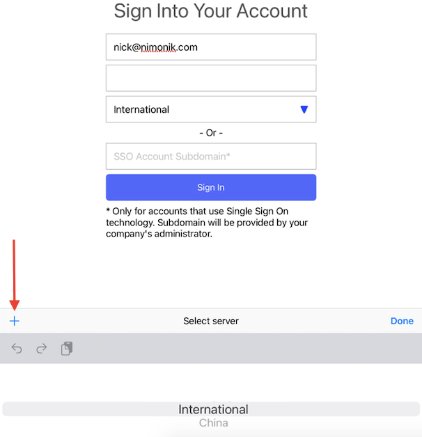 If your account uses a private server, click the + in the top right corner of the server selector, and enter your company domain (provided by your account administrator) in the resulting popup.