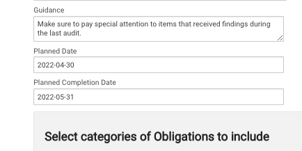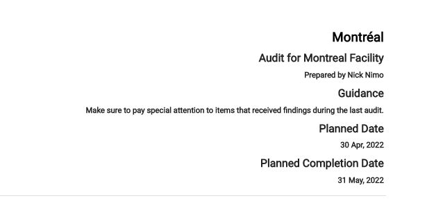 When you start and audit from either a company template or an internal action with custom fields, you will be able to populate each one on the creation page. For audits started from internal actions, the internal action values will be automatically populated.