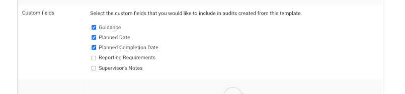 Use the checkboxes to determine which custom fields should appear in the audits and internal actions created from the template. Those with checked boxes will appear, those with unchecked boxes will not.