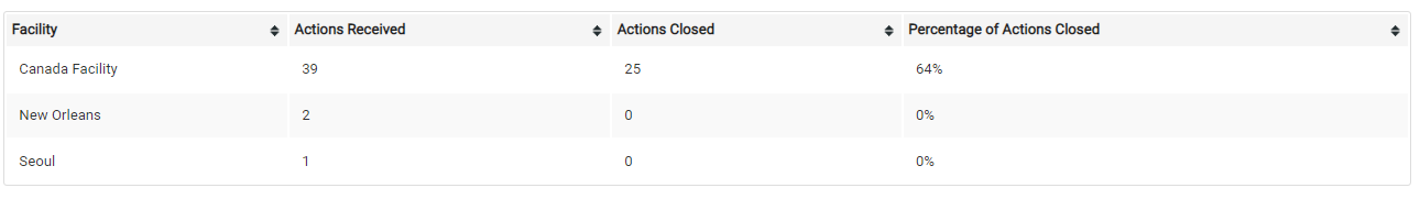 - Percentage of Actions Closed – Percentage of Actions that were closed for the selected Facilities