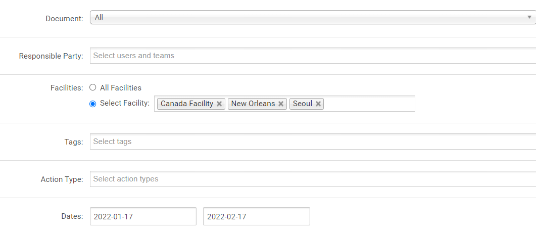 You can filter this report by Document, Responsible Party, Facilities, Tags, Action Types, and Dates.