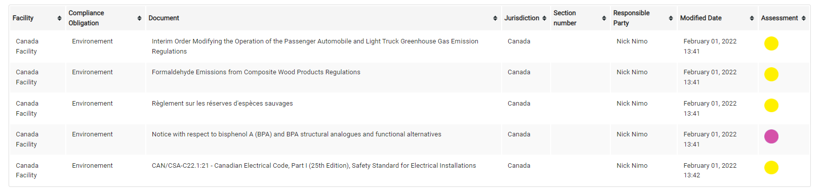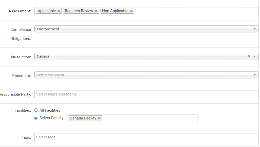 You will then be able to filter the report by Assessment, Registers, Jurisdiction, document, Responsible Party, Facility, and Tags.