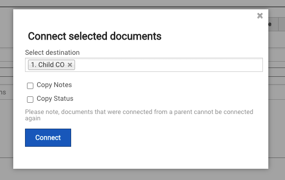 Once you click connect, a copy of each selected document will be added to the child Register, and the register level responsible party will be notified by email.