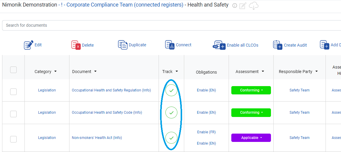 Documents and clauses with a check mark will receive update actions, while those with no check mark will not. You can change the track status of a document or clause at any time, by clicking on the check mark or box in the track column. You can also change track status for multiple documents or clauses at the same time by selecting and editing them and clicking “Edit”.