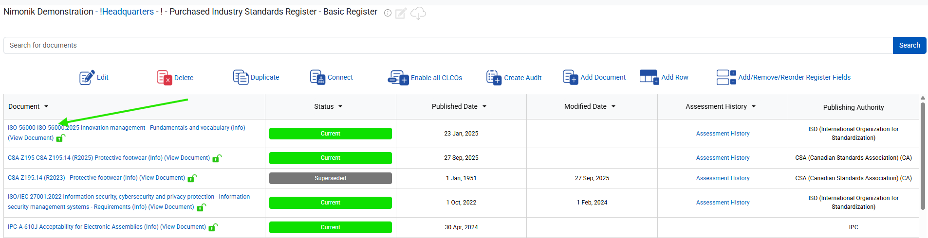 On the subsequent page, click the title of your Register to view the list of subscribed standards