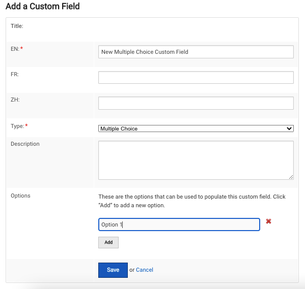 On the resulting page, you will be able to edit the title and description of the custom field, as well as the preset options as follows:
