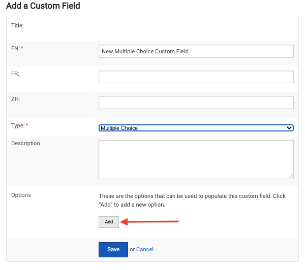 A text field will appear where you can enter an option that users can choose when populating the custom field.