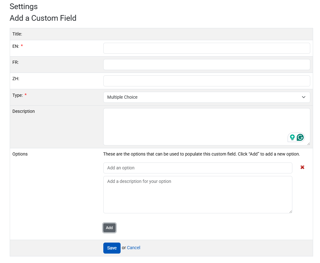 On the resulting page, you will be able to edit the title and description of the custom field, add descriptions to the existing options, or add additional options.