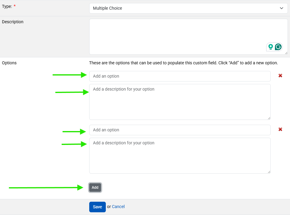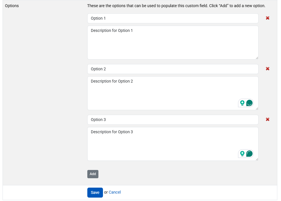 A text field will appear where you can enter options for users to select when populating the custom field. You can also add descriptions to help clarify what each option represents.