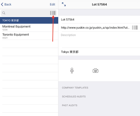 L'équipement de l'installation vous permet de trouver rapidement l'équipement approprié en scannant les codes-barres et les QR codes. Pour ce faire, appuyer sur l'icône des barres de code en haut du menu.
