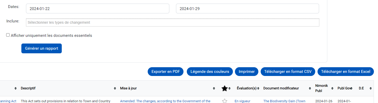 Vous pouvez filtrer le rapport par Juridiction, Thèmes, Statut du document, Type de Changement, Documents Essentiels et trier par chacun des en-têtes de colonne. Vous pouvez également choisir les dates (Date de publication Nimonik, Date de publication gouvernementale, Date d’entrée en vigueur) que vous souhaitez prendre en compte.