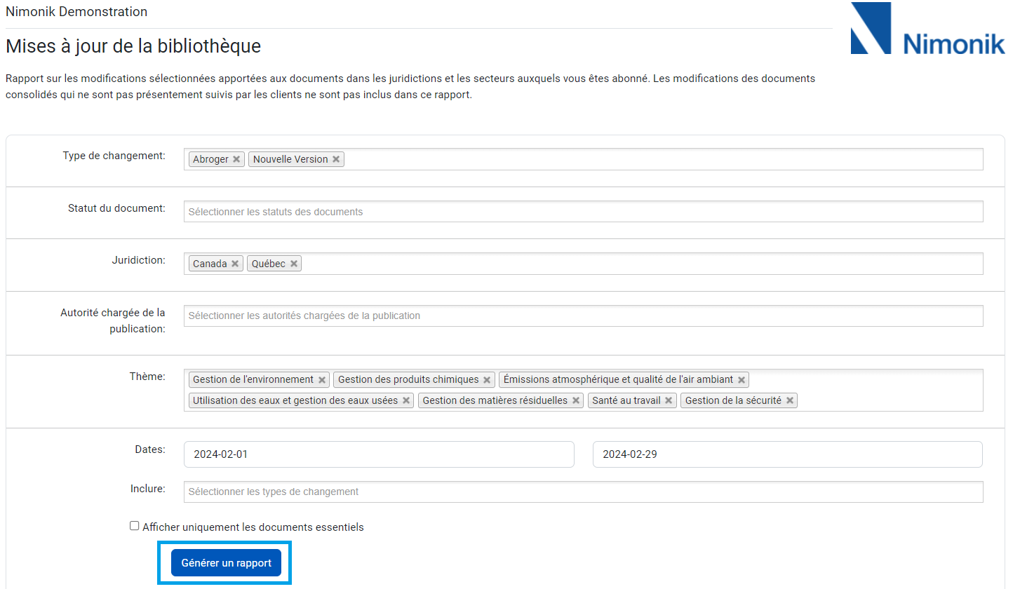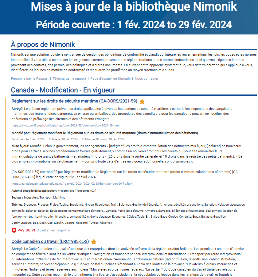 Le rapport sur les mises à jour de la bibliothèque présente une sélection de modifications significatives apportées aux documents dans les juridictions, les secteurs industriels et les thèmes couverts par votre abonnement (pas seulement ce qui se trouve dans vos registres de conformité). Pour plus d’informations sur le processus de mise à jour des documents de la bibliothèque Nimonik, veuillez consulter cette page d’aide.