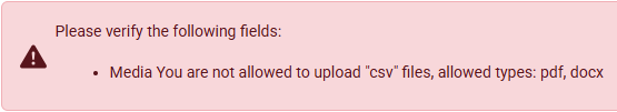 • Vous ne pouvez télécharger que des fichiers de type PDF ou docx en tant que documents internes. Si vous essayez de télécharger un autre type de fichier, vous recevrez le message d'erreur suivant :