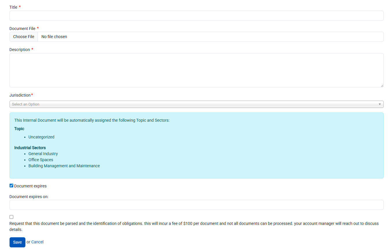 Expiration du document – Si le document expire, cochez cette case et entrez la date d'expiration dans le champ ci-dessous. À la date que vous avez saisie, le statut du document passera de « En vigueur » à « Archivé ».