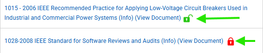 Lorsque vous effectuez une recherche dans la bibliothèque, vous remarquerez peut-être que certains documents sont accompagnés d'une icône représentant un cadenas à côté du titre. Ces icônes apparaissent à côté des normes industrielles que Nimonik propose désormais à l'achat dans le cadre d'un service d'abonnement. L'abonnement à une norme auprès de Nimonik permet aux utilisateurs d'accéder aux normes, de les consulter et de les télécharger à partir du logiciel.
